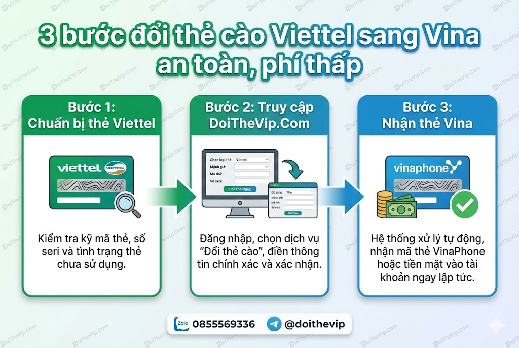 Trong thực tế, rất nhiều người mua nhầm thẻ Viettel trong khi đang dùng sim Mobifone, hoặc được cho, tặng thẻ Viettel nhưng không có nhu cầu sử dụng. Trong trường hợp đó, đổi thẻ cào Viettel sang Mobifone là giải pháp tiện lợi và tiết kiệm nhất. Dưới đây là quy trình chi tiết bạn có thể áp dụng ngay.
