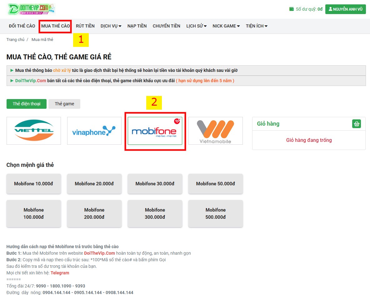 Bước 3: Mua thẻ cào Mobifone